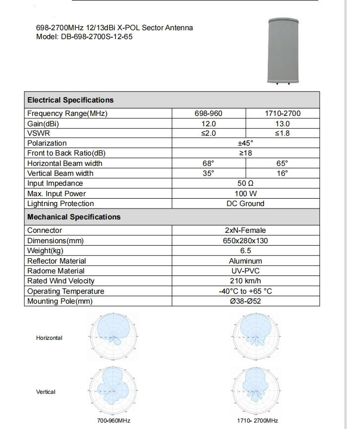 698-2700MHz 12/13dBi X-POL Sector Antenna