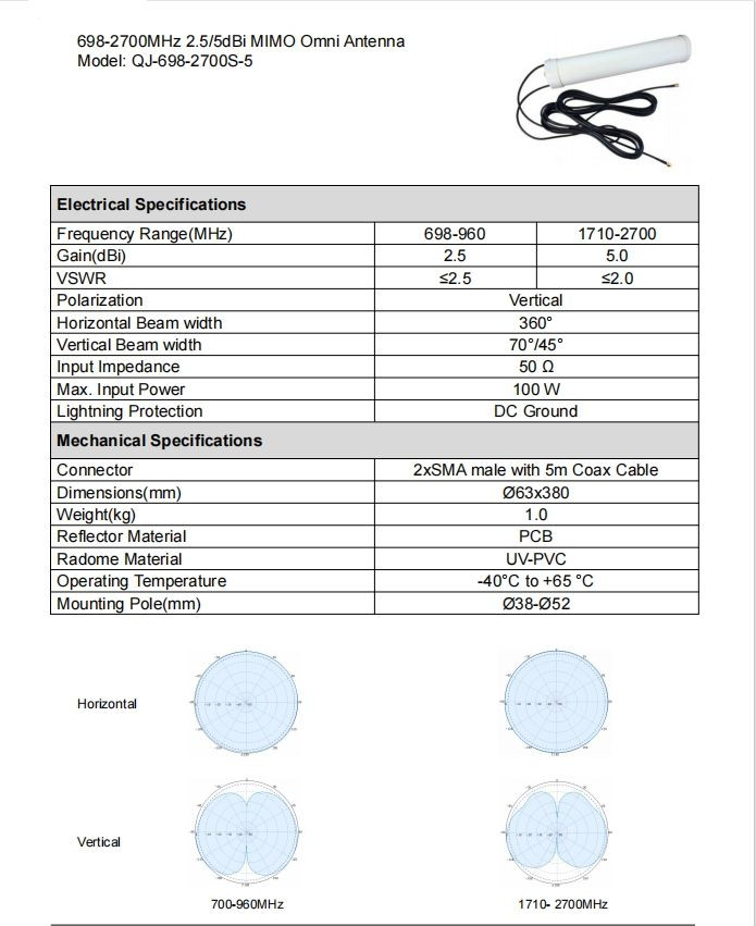 698-2700MHz 2.5/5dBi MIMO Omnidirectional Antenna