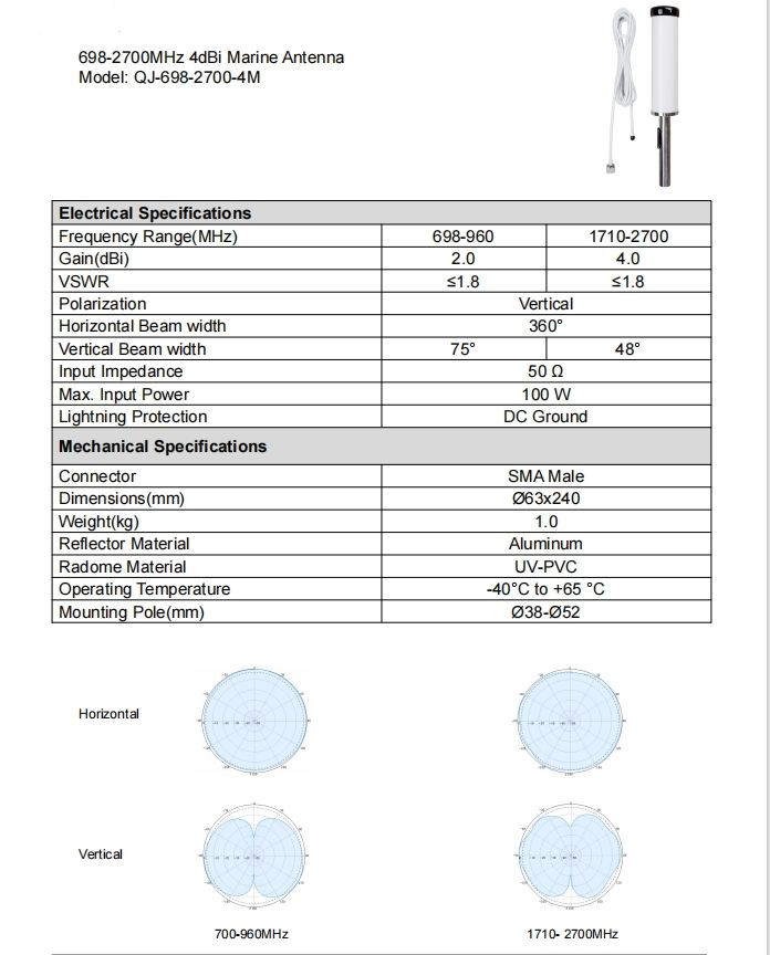698-2700MHz 2.5/5dBi MIMO Omnidirectional Antenna
