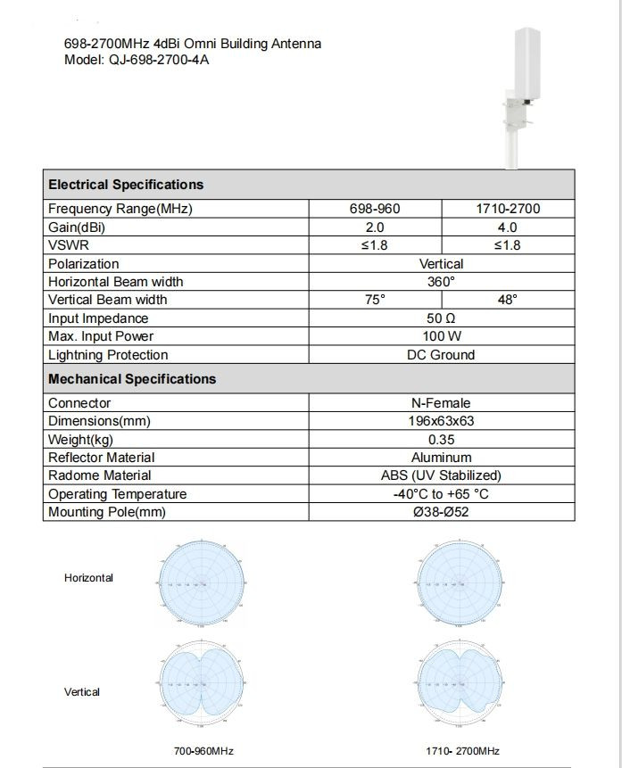 698-2700MHz 4dBi Omnidirectional Building Antenna