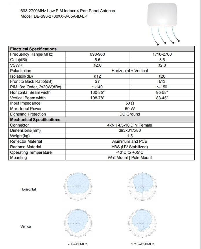 698–2700MHz Low PIM Indoor 4-Port Panel Antenna