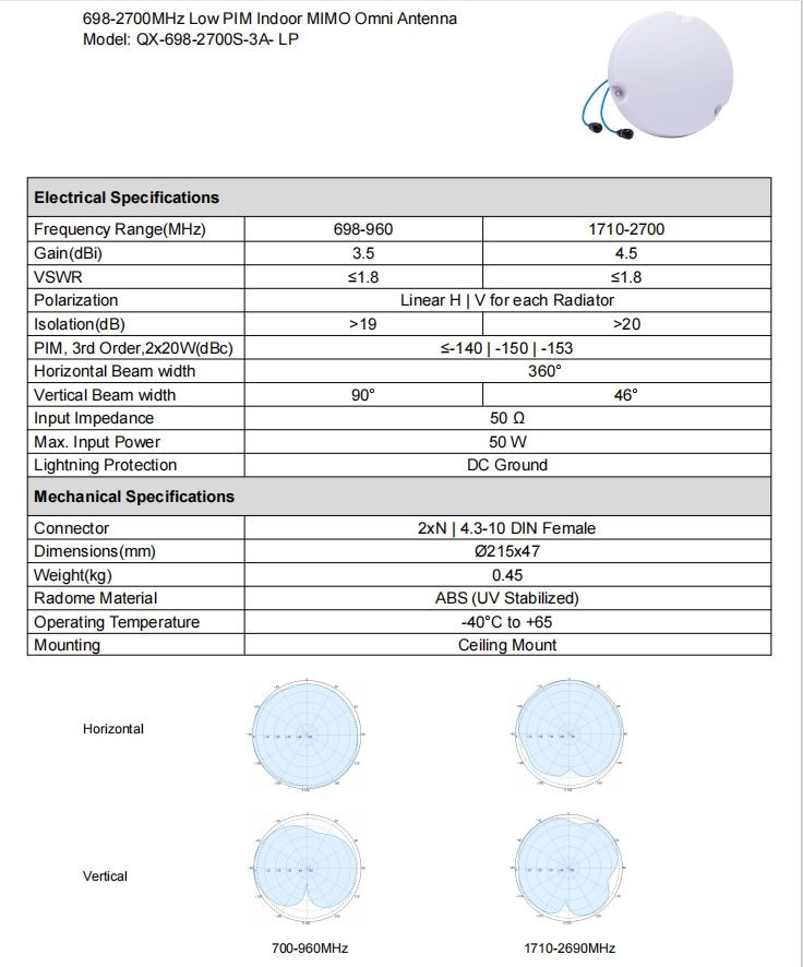 698–2700MHz Low PIM MIMO Slim Omnidirectional Antenna