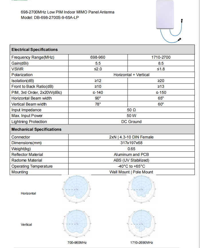 698–2700MHz Low PIM Indoor MIMO Panel Antenna