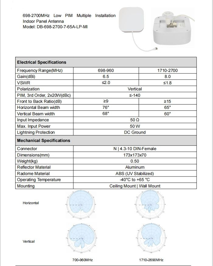 698–2700MHz Low PIM Multiple Installation Indoor Panel Antenna